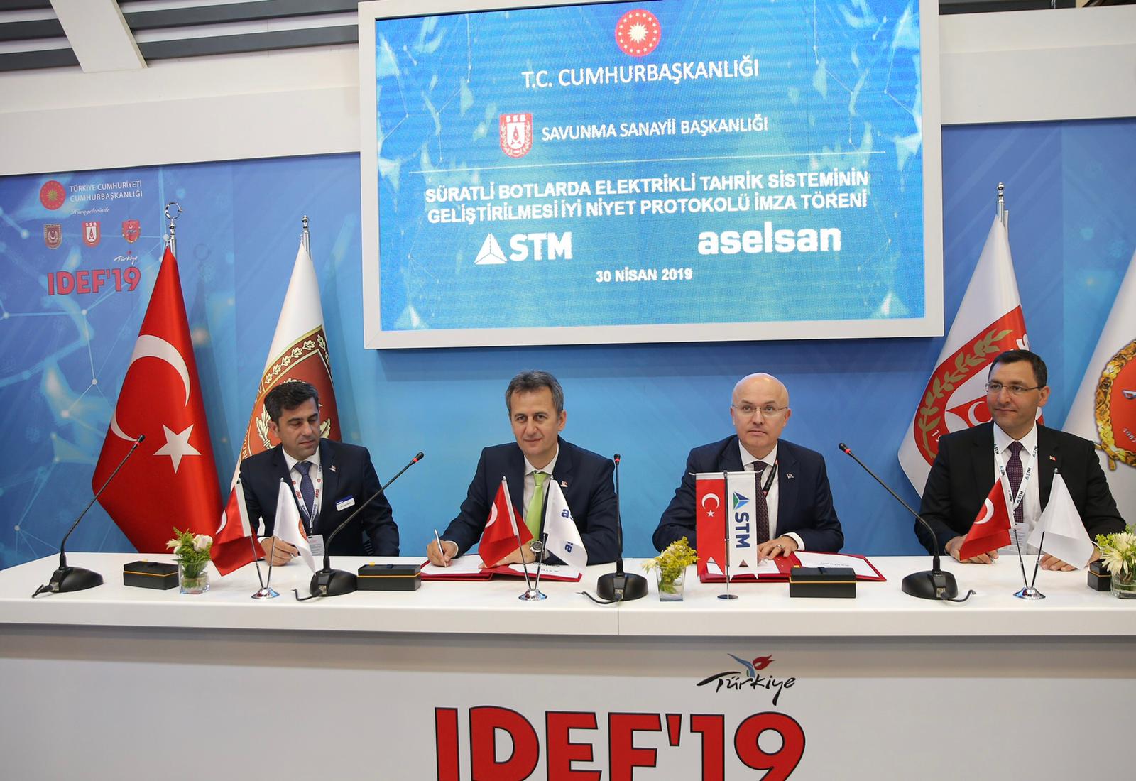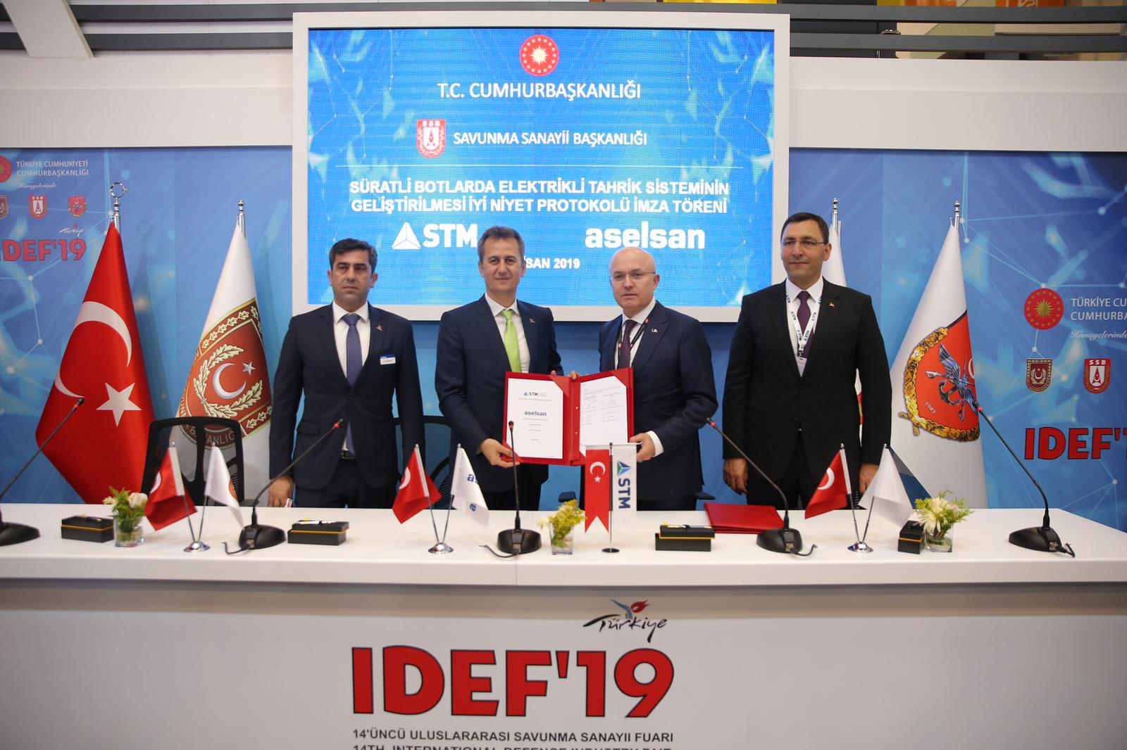 ASELSAN ile STM arasında Süratli Botlarda Elektrikli Tahrik Sisteminin Geliştirilmesi konusunda İyi Niyet Anlaşması IDEF 2019 Uluslararası Savunma Sanayi Fuarında atıldı.