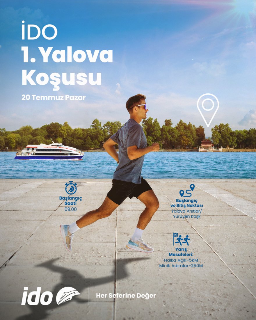 Türkiye Atletizm Federasyonu (TAF) teknik desteği ve Winner Sport Organizasyonu ile gerçekleşecek İDO 1. Yalova Koşusu sabah 9.00’da Yalova’nın önemli simgelerinden biri olan Yürüyen Köşk Gezi Parkuru, Yalova Sahil Hattı’nda gerçekleşecek. Birçok farklı kategoride gerçekleşecek koşu gün boyu sürecek. Orhan Güner direktörlüğünde başlayacak yarışlara son kayıt tarihi: 18.07.2025 saat 17:00.