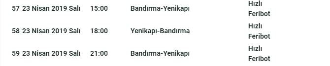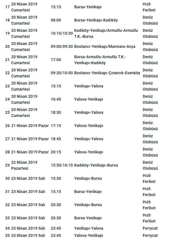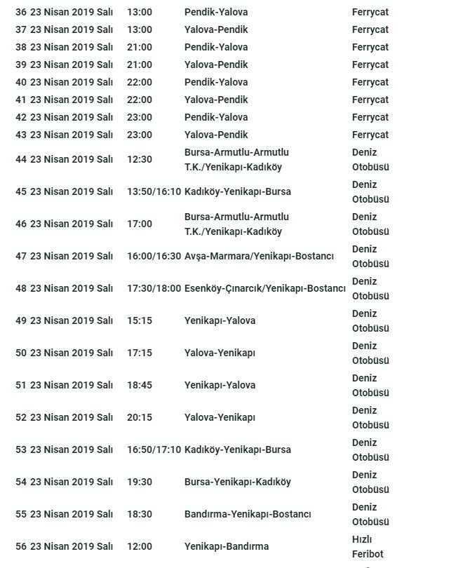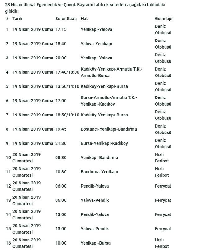 İDO, 23 Nisan Ulusal Egemenlik ve Çocuk Bayramı tatilinin Salı gününe gelmesi nedeniyle Cuma-Cumartesi gidiş, Salı dönüş olacak şekilde deniz otobüsü, hızlı feribot ve ferrycat seferleri için aşağıda listelenen 59 ek seferi satışa açtı.