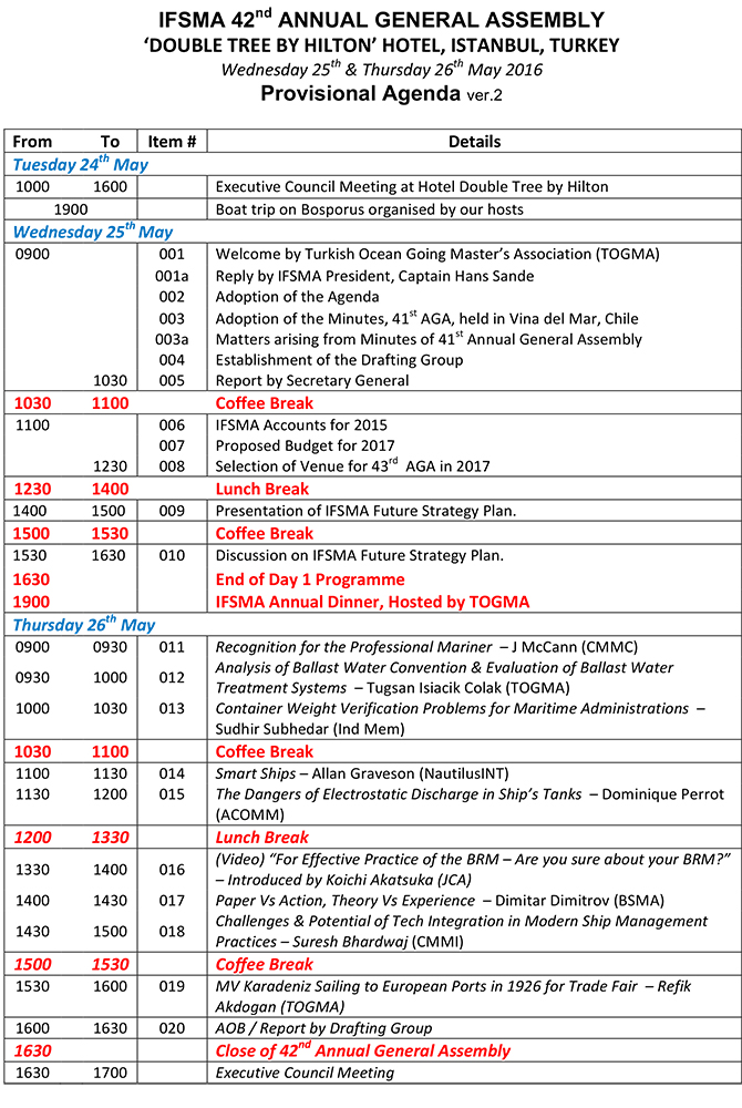Uluslararası Gemi Kaptanları Dernekleri Federasyonu (IFSMA), 42.Genel Kurul Toplantısı 24-26 Mayıs tarihlerinde Türk Uzakyol Gemi Kaptanları Derneği'nin ev sahipliğinde İstanbul'da yapılacak.