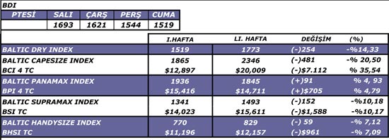 Yeni yılın ilk haftasında capesize endeksinde %20’nin üzerinde düşüş oldu ve bu durum genel endeksi % 14 aşağıya çekerek 1500 puana iyice yaklaştırdı. Supramax ve handy gemilerin de kazançlarının düştüğü haftada sadece panamax kazançları % 5’e yakın arttı.