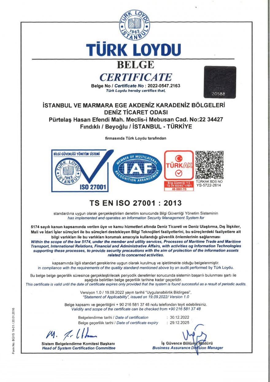 İMEAK Deniz Ticaret Odası’nda Türk Loydu tarafından gerçekleştirilen TS EN ISO 27001:2013 standardı denetimi sonucunda Bilgi Güvenliği Yönetim Sisteminin 5174 sayılı kanun kapsamında verilen üye ve kamu hizmetleri altında Deniz Ticareti ve Deniz Ulaştırma, Dış İlişkiler, Mali ve İdari İşler süreçleri ile bu süreçleri destekleyen Bilgi Teknolojileri faaliyetlerini, bu süreçteki faaliyetlere ait bilgi varlıkları ile bu varlıkları korumak amacıyla kullandığı güvenlik önlemlerinin sağlanması kapsamında ilgili standart gereklerine uygun olarak kurulduğu ve işletilmekte olduğu belgelendi.