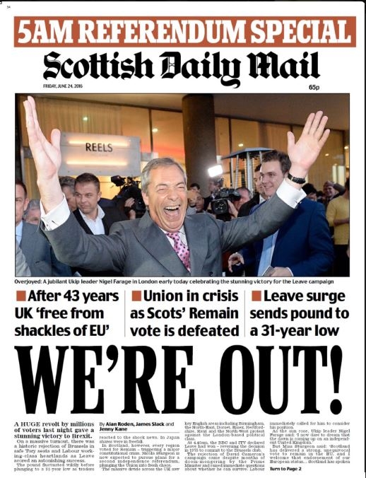 Scottish Daily Mail gazetesi de sabaha karşı 05:00'da baskıya girdi. İskoç gazetesi de "Çıktık" başlığını kullandı
