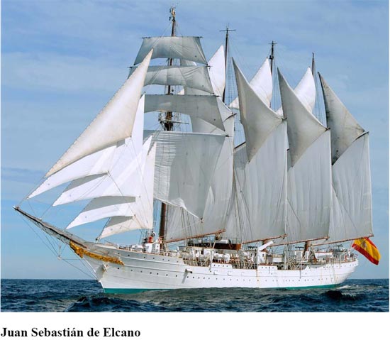 Bu gemilerden biri, İspanyol Donanması’nın “Juan Sebastián Elcano Eğitim Gemisi”. Bu gemi 1927 yılında inşa edilmiş modern bir yelkenli gemi olup, o tarihten bu yana İspanyol Donanması’nın her yeni subay devresi için altı ay süreyle olmak üzere, uygulamalı gemicilik eğitimi alanında kullanılmakta. Bu altı ay boyunca, en azından Atlas Okyanusu’nu kapsayacak şekilde okyanus seyahatleri gerçekleştirilir. Şu ana kadar yapılmış olan on seyir, dünyanın etrafını dolaşmakla aynı anlama geliyor. Diğer gemi ise, XVII. yüzyıl kalyonlarının bir kopyası olan Endülüs Kalyonu.