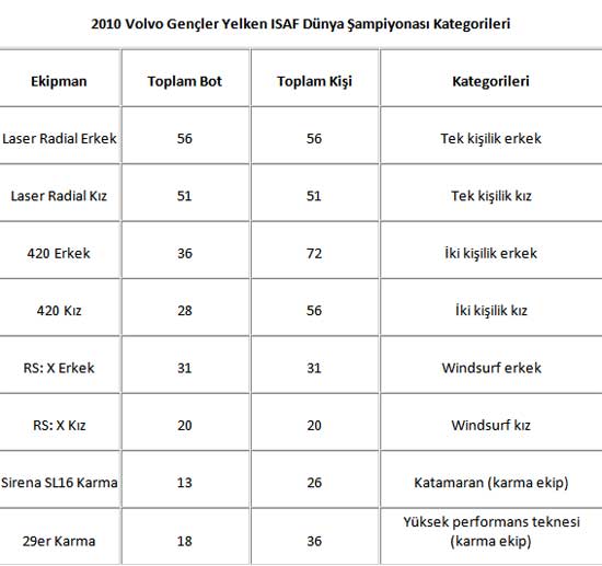 08-17 Temmuz tarihleri arasında İstanbul’da gerçekleşecek 19 yaş altı ‘Volvo Gençler Yelken ISAF Dünya Şampiyonası’nda sporcular ilk defa 5 sınıfta 8 kategoride yarışacak. Kızlar ve Erkekler kategorilerinde düzenlenecek yarışlarda her bir kategorinin ‘Dünya Şampiyonları’ belirlenecek.