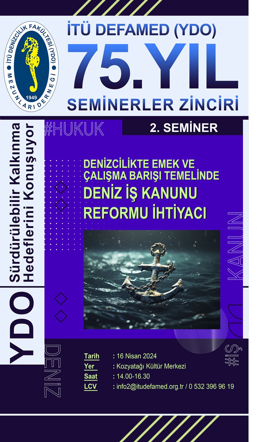 İstanbul Teknik Üniversitesi (İTÜ) Denizcilik Fakültesi Mezunları Derneği, kuruluşunun 75. yılını kutluyor ve bu özel etkinlik kapsamında çeşitli seminerler düzenliyor. Derneğin planlanan seminerler serisinin ikinci bölümü, "Denizcilikte Emek ve Çalışma Barışı Temelinde Deniz İş Kanunu Reformu İhtiyacı" başlığı altında gerçekleştirilecek.