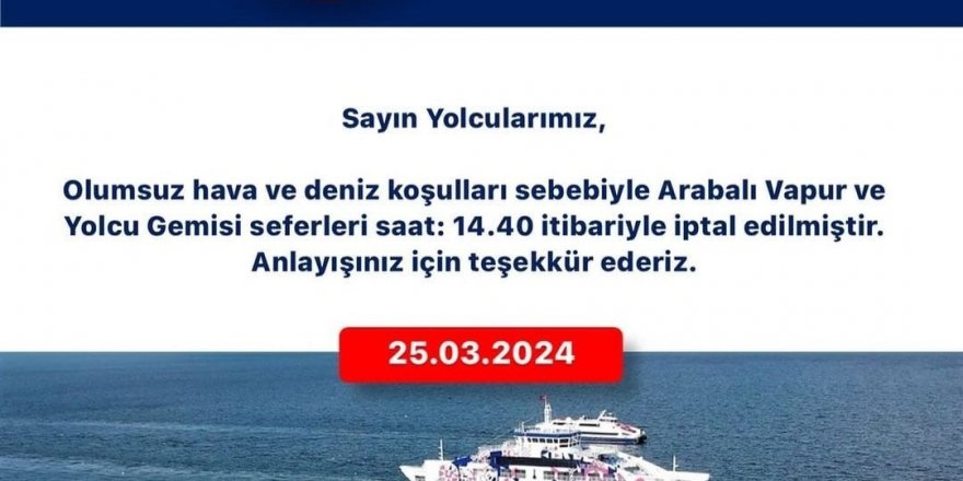 İzmir'de, olumsuz hava ve deniz şartları nedeni ile arabalı vapur ve yolcu gemisi seferleri geçici olarak iptal edildi. İZDENİZ'den yapılan açıklamada şu ifadelere yer verildi: "Olumsuz hava ve deniz şartları sebebiyle arabalı vapur ve yolcu gemisi seferleri saat 14.40 itibariyle iptal edilmiştir. Anlayışınız için teşekkür ederiz.”