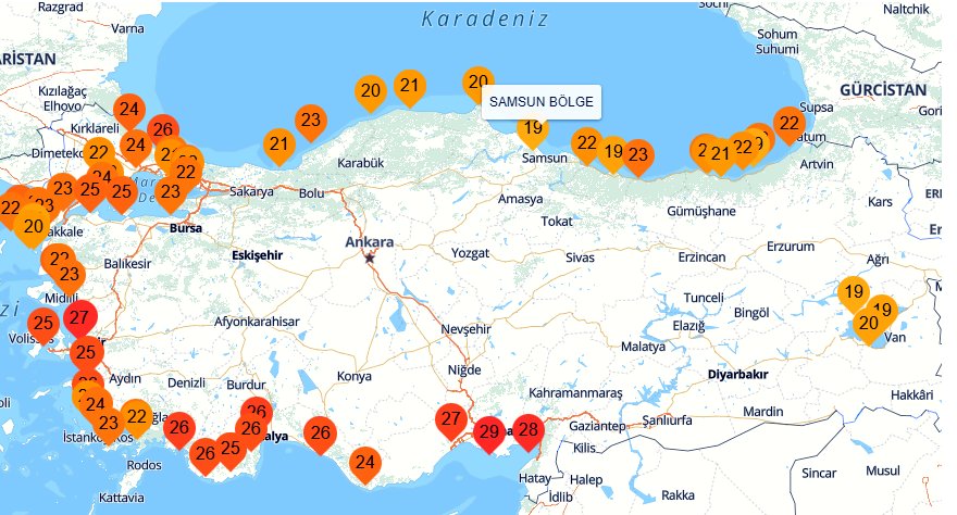 Meteoroloji Genel Müdürlüğü(MGM) deniz suyu sıcaklıkları verilerine göre 10 Haziran itibari ile Karadeniz’e kıyısı olan illerde deniz suyu sıcaklıkları Artvin’de 22 derece, Rize’de 22 derece, Trabzon’da 21 derece, Giresun’da 23 derece, Ordu’da 19-22 derece, Samsun’da 19 derece, Sinop’ta 20 derece, Kastamonu’da 21 derece, Bartın’da 21 derece, Zonguldak’ta 23 derece, Zonguldak-İstanbul arasında 21 derece, İstanbul batı yakasında 26 derece ve Kırklareli’nde ise 24 derece olarak ölçüldü.