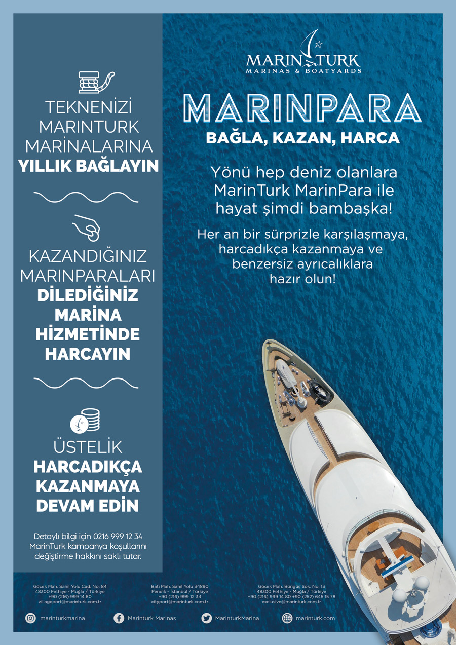 MarinTurk Marinaları; Göcek ve İstanbul’da yıllık bağlama yapan tekne sahiplerine özel avantajlı bir kampanyayı hayata geçirdi. Buna göre, teknesini MarinTurk Marinaları’na yıllık bağlayan tekne sahipleri, ana hizmetlerden kazanacakları MarinPara’ları yan hizmetlerde ve diledikleri MarinTurk lokasyonlarında harcayabilecekler.