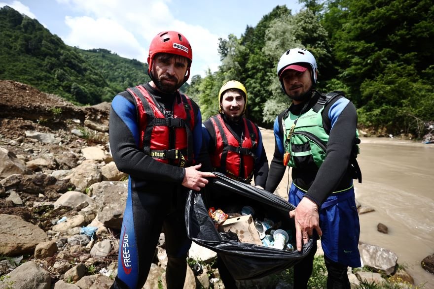 Rafting kıyafetlerini giyip çöp poşetlerini yanlarına alan Demircan ve sporcular, 16 kilometrelik parkurda kürek çekmenin yanı sıra su yüzeyi ve kenarlarında temizlik yaptı.