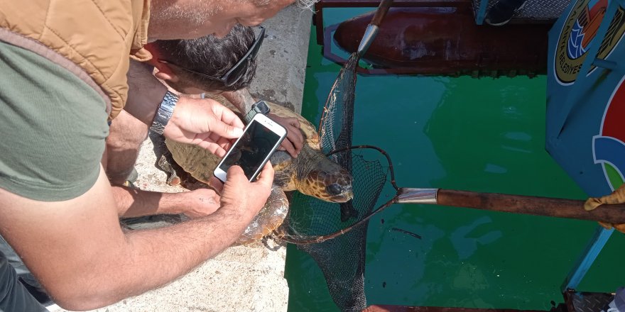 Misinadan kurtularak özgürlüğüne kavuşan caretta, Deniz Kontrol Ekibi ve Sahil Güvenlik Ekibi eşliğinde liman dışına götürülerek denize bırakıldı.