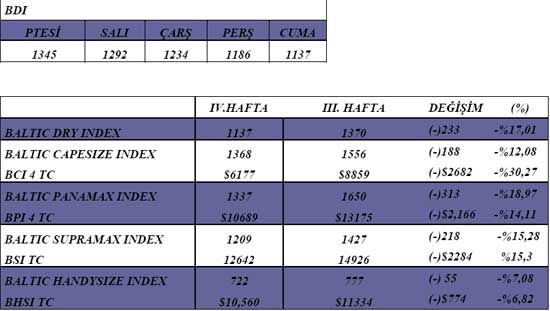 BDI geçen hafta da düşüşüne devam ederek 233 puan kaybıyla % 17 geriledi, Cuma günkü kapanış 1137 oldu. Bu hafta endeksin 1000 puanın altına inmesine kesin gözüyle bakılıyor. Geçen hafta bütün tonaj gruplarında ağır kayıplar görüldü. En büyük düşüş % 19 ile panamax endeksinde oldu. 2008 sonları ve 2009 yılı başlarından bu yana görülmeyen laid up uygulamasını bazı armatörlerin tekrar düşündüğü söyleniyor.