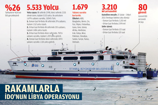 Libya'da yaşanan halk ayaklanması, farklı ülkelerden binlerce kişiyi mağdur etti. Ancak Türk hükümeti olayın ardından ani bir kararla bu ülkedeki binlerce vatandaşımızı tahliye ederek önemli bir başarı ortaya koydu. Bu tahliye operasyonları İstanbul Deniz Otobüsleri'ne (İDO) ait olan 'Osman Gazi 1' ve 'Orhan Gazi 1' feribotlarıyla gerçekleştirildi. Libya'ya iki kez çıkarma yapan bu feribotlar, İstanbul'a ulaştı.