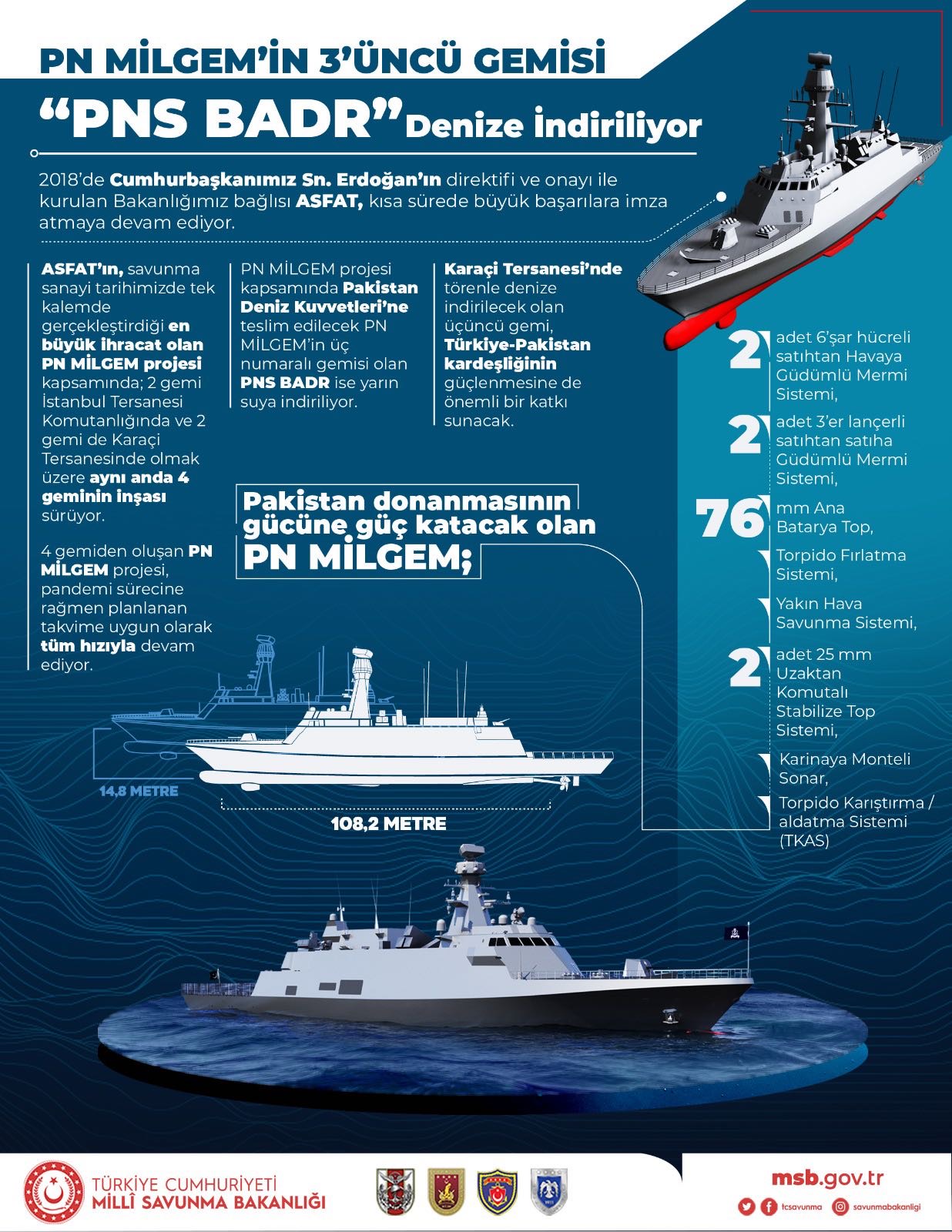 Proje kapsamındaki gemilerin Pakistan'ın savunmasında hayati görevler üstleneceğine, Pakistan Silahlı Kuvvetlerine faydalı olacağına, bölgede ve dünyada barış ve istikrara katkıda bulunacağına inandığını kaydeden Akar, "25 Ekim 2020'de Karaçi Tersanesi'nde gerçekleştirilen MİLGEM korvet PNS Badr'ın kızağa konma törenine katılmaktan onur duydum. Şimdi, bu geminin denize indirilme törenine katılmak benim için bir zevk." açıklamasında bulundu.