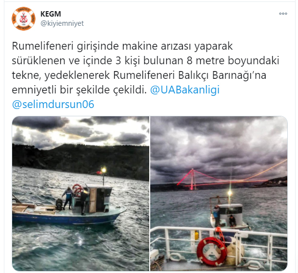 "Rumelifeneri girişinde makine arızası yaparak sürüklenen ve içinde 3 kişi bulunan 8 metre boyundaki tekne, yedeklenerek Rumelifeneri Balıkçı Barınağı’na emniyetli bir şekilde çekildi."