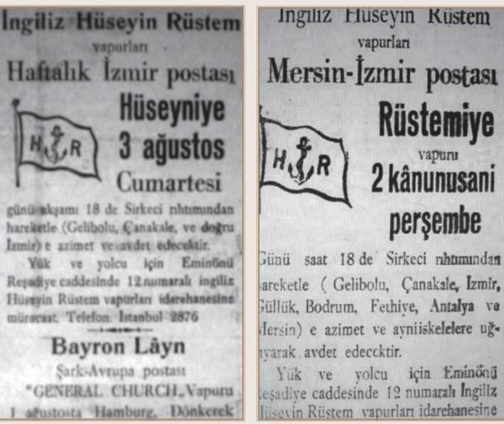 İngiliz Hüseyin Rüstem Vapurları ilanlarının en yoğun olduğu yıllar 7 1930 - 1931 yıllarıdır. Yeni yazıyla ilk ilan 1 Ocak 1930 tarihinde Cumhuriyet Gazetesi’inde yeralmıştır. Bu ilanda şöyle denilmektedir; İngiliz Hüseyin Rüstem Vapurları, Mersin - İzmir Postası. Rüstemiye Vapuru 2 Kanunusâni Perşembe günü Saat 18.00’de Sirkeci Rıhtımı’ndan hareketle Gelibolu, Çanakkale, İzmir, Güllük, Bodrum, Fethiye, Antalya ve Mersin’e azimet ve ayni iskelelere uğrayarak İstanbul’a azimet edecektir. Yük ve yolcu için Eminönü Reşadiye Caddesi’nde 12 Numaralı İngiliz Hüseyin Rüstem Vapurları idarehanesine müracaat. Tel: İstanbul 2876.