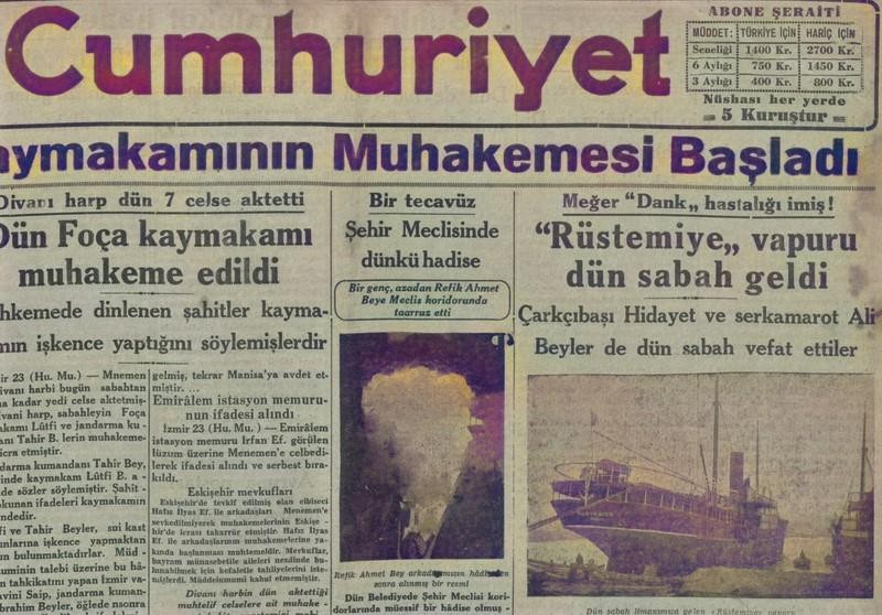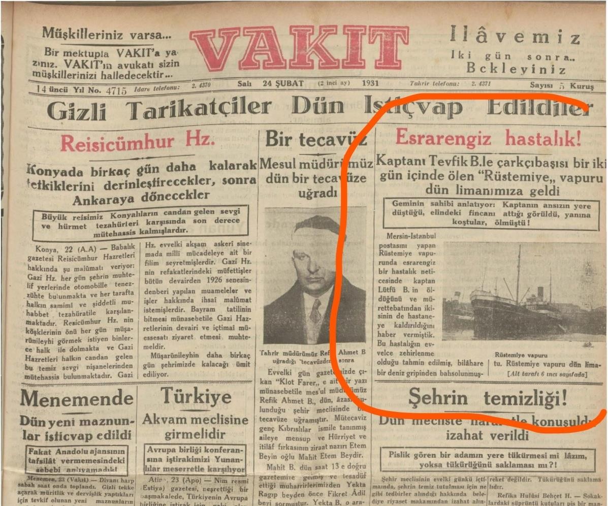 24 Şubat 1931 tarihli Cumhuriyet Gazetesi “Dank mı, Değil mi?” başlığıyla esrarengiz hastalığı sorgulamakta ve şöyle devam etmektedir; “Çarkçıbaşı Hidayet ve Serkamarot Ali Beyler de dün vefat ettiler; Rüstemiye Vapuru Süvarisi Tevfik Bey’in ölümüyle neticelenen esrarlı hastalığa sahne olan Rüstemiye vapuru dün saat 10’da İstanbul Limanı’na gelmiştir. Hasta olan ikinci ve üçüncü kaptanlarla mürettebattan bazıları yolcuların çıkmasını müteakip tedavi ve istirahat için evlerine gitmişlerdir. Bu esrarengiz hastalığın nasıl başladığını geminin kâtibi Remzi Bey şöyle anlatmıştır; “Mersin’den hareket ettik. Taşucu’na geldikten sonra bazı mürettebatta hastalık belirtileri görülmeye başladı. Mide bulanması, ishal gibi alâmetlerle beraber otuz dokuz dereceye kadar çıkan ateş rahatsızlıkları vardı. Taşucu’ndan hareketten sonra hastalananların sayısı artmaya başladı. Vapur sahiplerinden Ali Kaptan Bey de şiddetle hastalandı. Antalya’ya kadar hem hastaların sayısı arttı ve hem de daha korkutucu oldu. Antalya’da askeri doktorlardan Adil Bey vapura davet edildi. Hepimizi muayene etti ve ilaçlar verdi. Kurşun emlahile (etkisi ile) zehirlenmiş olduğumuzu söyledi Antalya’dan hareket ettik. Rodos’a geldik. Bundan sonra Çarkçıbaşı Hidayet ve Serkamarot Ali Beyler hastalandılar. Ertesi gün vapur süvarisi Fethi Bey de şiddetli ateşle beraber bulantı ile karışık maraz alâmetleri gösterdi. Vapurda bulunan yolculardan hiçbirisi hastalanmamıştı. Bu maraz gûya vapurculara musallat olmuştu. Nihayet ben de hastalandım. İzmir’e muvasalat ettik. Vapur süvarisi Fethi Bey ‘Aman ben fena oluyorum’ diyerek güverteye çıktı; Bir sandalye verdik ve kıvrana kıvrana orada vefat etti. İzmir’e geldiğimizde Sıhhıye Dairesi’ne haber vermiştik. Doktorlar yetişinceye kadar hastaların durumu ciddileşti. Çarkçıbaşı ile serkamarot hastaneye nakledildiler. İzmir Müdde-i Umumisi tahkikat yaptı.