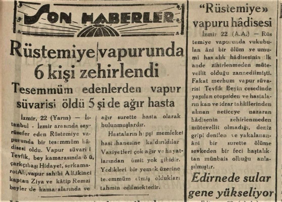 Geç vakit aldığımız habere göre Rüstemiye Vapuru’ndaRüstemiye Vapuru’nda zehirlenenlerden ve İzmir Memleket Hastanesi’nde tedavi altında olanlardan Serkamarot Ali Efendi de vefat etmiştir. Diğer mürettebatın ölmelerinden endişe edilmektedir.