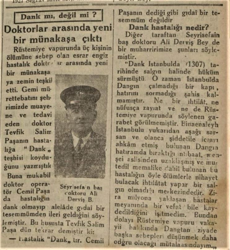 Rüstemiye Vapuru’ndaki esrarengiz hastalık yeni bir münakaşa nedeni olmuştur. İstanbul’a gelen mürettebatı muayene ve tedavi eden Dr. Tevfik Salim Paşa’nın (Prof. Dr. Tevfik Sağlam) hastalığın Dank hastalığı olduğu yönünde koyduğu teşhise karşılık, Operatör Cemil Paşa, Cumhuriyet Gazetesi’ne gönderdiği bir mektupta bu hastalığın Dank hastalığı olmasını tasavvur edemediğini, bunun konservelerden ileri gelebilecek bir zehirlenme olabileceğini ileri sürmüştür. Cemil Paşa, mektubunda özellikle şu nokta üzerinde durmaktadır: “Vapurun kahvecisi Ali hastalanmamıştır. Kaptan ve Mürettebat gemi Mersin’den hareket ettikten sonra yemek yemişler ve hastalanmışlardır. Halbuki kahveci Ali Antalya’da vapura binmiş ve bu yemekten mahrum kaldığından dolayı hastalanmamıştır.”
