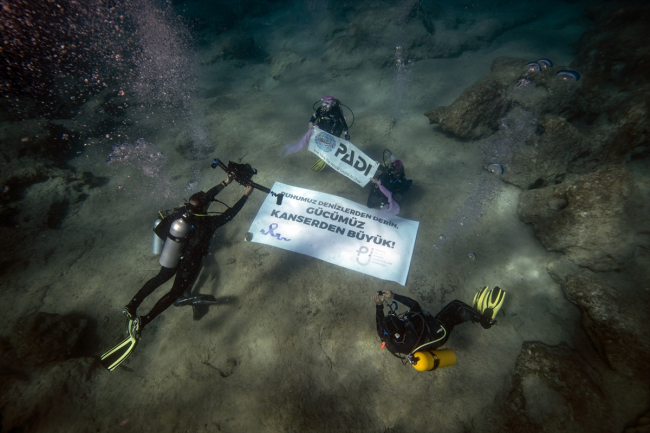 Dalış sırasında katılımcıların bileklerine bağladıkları pembe tüller, tüplü dalış ekipmanlarının üzerine bağladıkları pembe kurdeleler, kafalarına taktıkları pembe bandanalar ile pembe ve mor renkteki dalış maskeleri dikkati çekti. Ekip, su altında "Gücümüz Kanserden Büyük" yazılı pankart açtı.