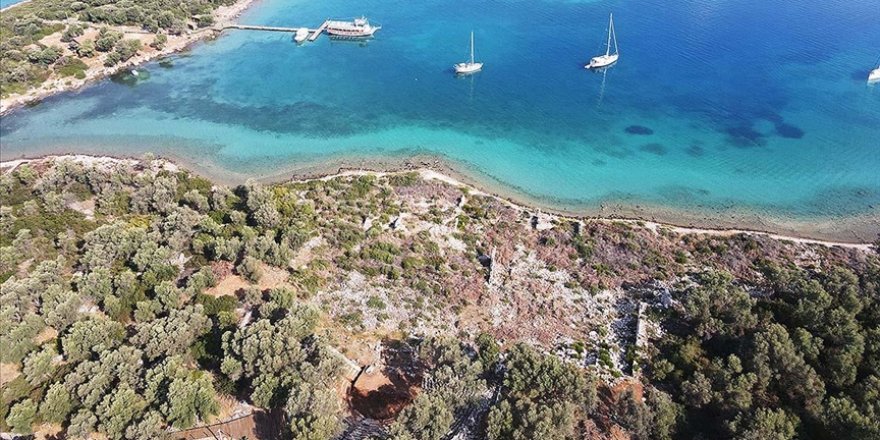 Muğla'da Apollon Tapınağı, tiyatro ve mezarlık kalıntılarının bulunduğu adadaki Kedrai Antik Kenti'ne ulaşan kazı ekibi, tarihi kalıntıları gün yüzüne çıkarıyor.