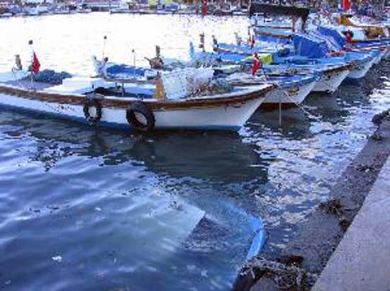 İzmir'in Dikili ilçesinde, şiddetli lodos dün gece etkisini artırdı. Hızı zaman zaman 70 kilometreyi bulan lodos yüzünden balıkçı barınağında bulunan tekler hasar gördü.