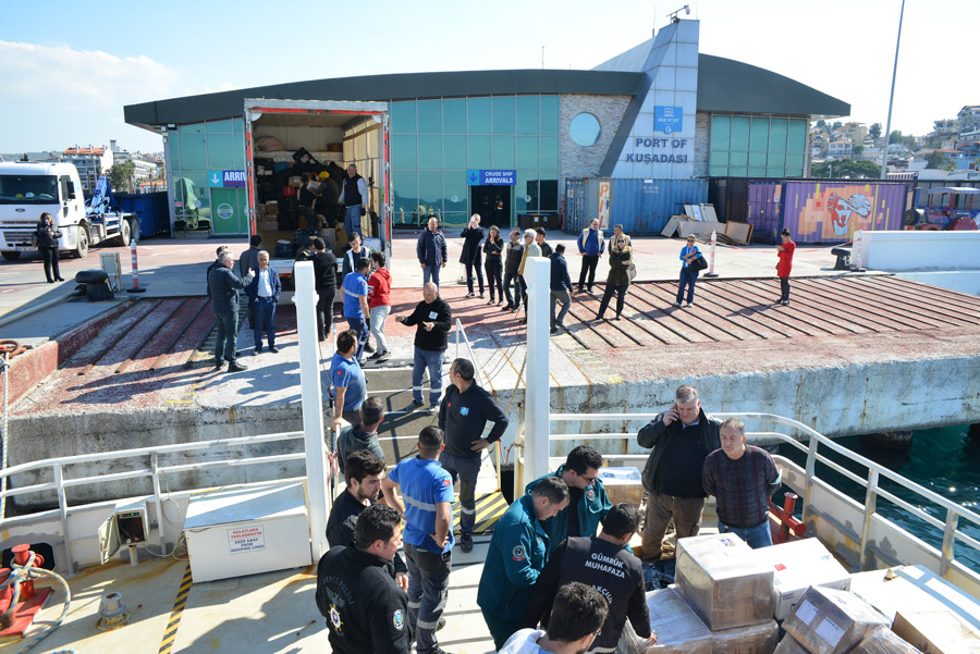 Kuşadası Ege Port Limanı'na bir feribotla getirilen battaniye, kıyafet ve ilaç gibi ürünlerin yer aldığı 530 palet yardım malzemesi, Kaymakamlık ve liman yetkilileri tarafından kabul edildi.