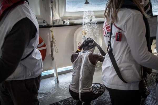 Göçmenler benzin ihtimaline karşı teker teker yıkandılar.