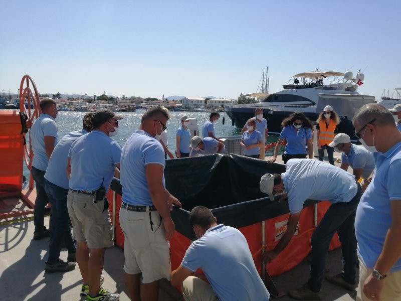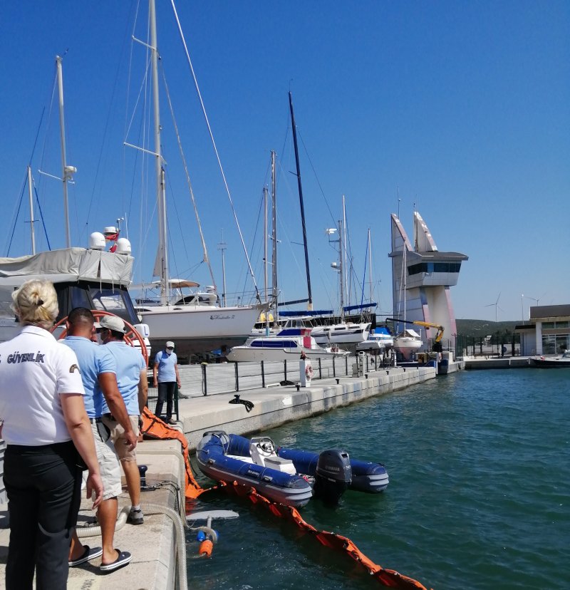 İzmir Sığacık’ta faaliyet gösteren yat limanı Teos Marina’da, liman sahasında denize döküntü kazası olasılığına karşı, tehlikenin ve deniz kirliliğinin engellenmesi amacıyla saniyelerle yarışarak tatbikat gerçekleştirildi.