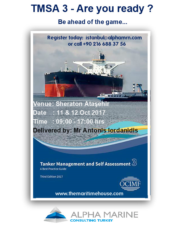 TMSA, işletmelerin 3. parti denetlemeler ve kendi sistemlerini denetlemeleri, bu denetlemelerde aksayan yönleri ortaya çıkarıp giderebilmeleri için işliyor. Alpha Marine Consultancy 'TMSA 3' semineri tüm tanker işletmecileri için büyük önem taşıyor.