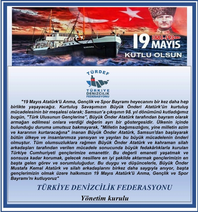 Türkiye Denizcilik Federasyonu (TÜRDEF) Yönetim Kurulu, 19 Mayıs Atatürk'ü Anma, Gençlik ve Spor Bayramı dolayısıyla kutlama mesajı yayınladı.