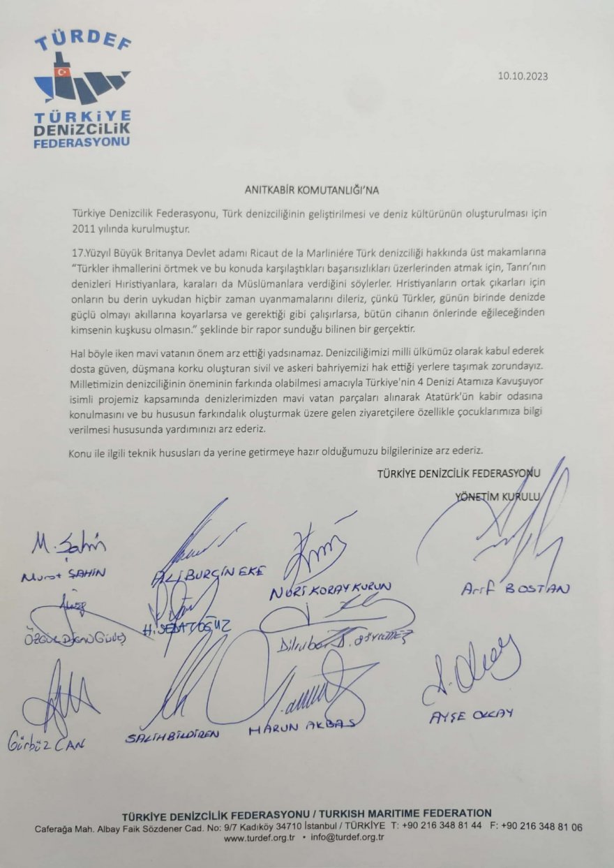 ‘Denizciliğimizi milli ülkümüz olarak kabul ederek dosta güven, düşmana korku oluşturan sivil ve askeri bahriyemizi hak ettiği yerlere taşımak zorundayız. Milletimizin denizciliğinin öneminin farkında olabilmesi amacıyla Türkiye’nin 4 Denizi Ata’sına Kavuşuyor isimli projemiz kapsamında denizlerimizden alınan deniz sularının Atatürk’ün kabir odasına konulmasını ve bu hususun farkındalık oluşturmak üzere gelen ziyaretçilere özellikle çocuklarımıza bilgi verilmesi hususunda yardımlarınızı arz ederiz’.