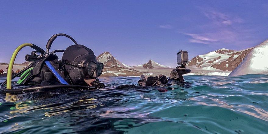 Sefer katılımcıları 7. Ulusal Antarktika Bilim Seferi Çevre Zabiti Dr. Burak Karacık ve Anadolu Ajansı Foto Muhabiri Şebnem Coşkun, Türk Bilim Kampı'nın bulunduğu Horseshoe Adası'nda yer alan ve buzuldan kopan bir buzdağına farkındalık dalışı gerçekleştirdi.