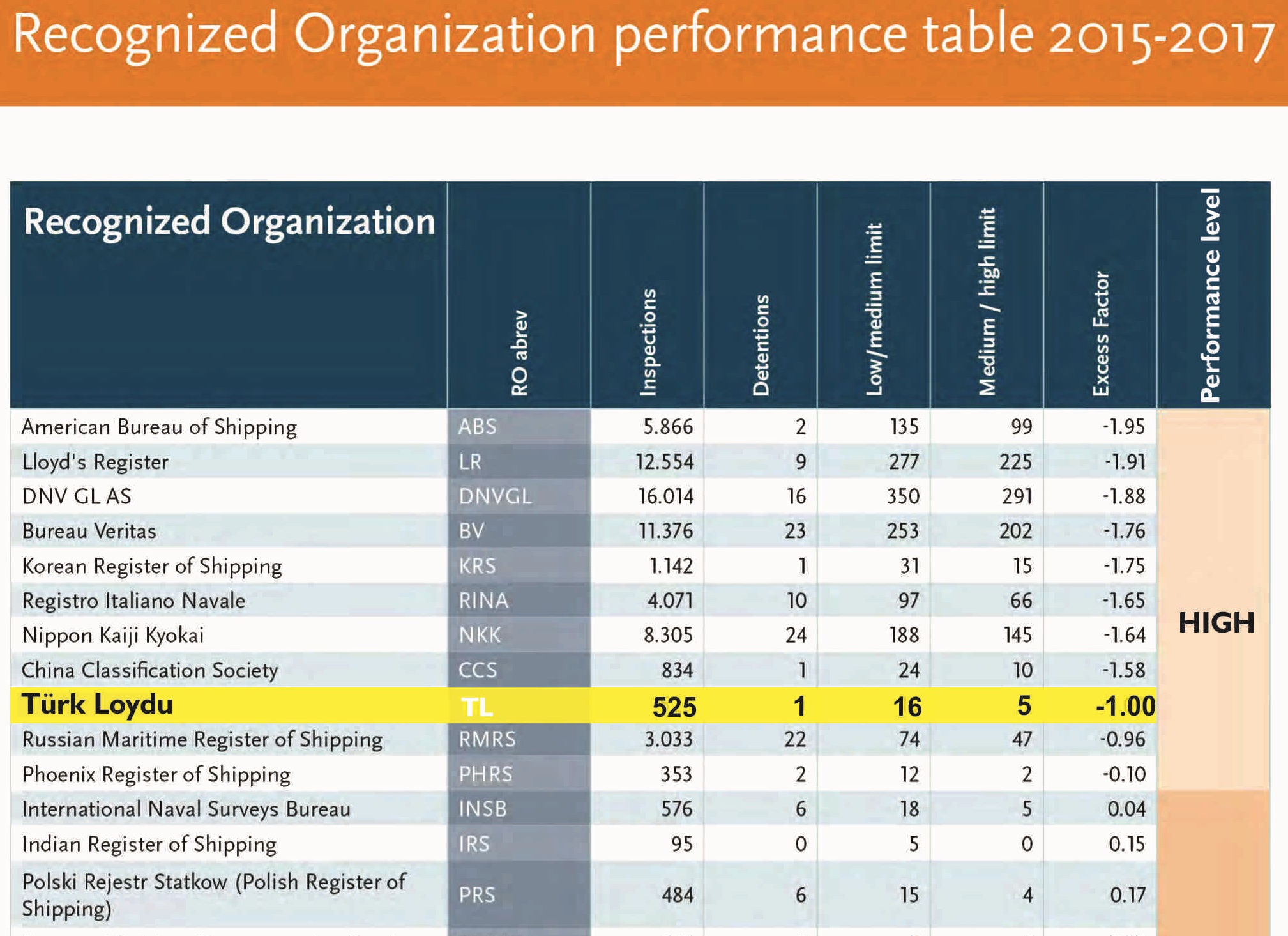 Liman Devleti Kontrolleri (PSC) rejimleri arasında en önemlisi olarak değerlendirilen Paris Liman Devleti Kontrolü Mutabakatı (Paris MoU) web sitesinde yenilenen ve 2015 - 2017 yıllarını kapsayan son üç yıllık süre içerisinde gemiler üzerinde yapılan denetleme sonuçlarına ilişkin olarak hazırlanan Yetkilendirilmiş Kuruluşlar Performans Tablosu’nda, bir çok rakibini geride bırakan Türk Loydu son 12 yıldır gediklisi olduğu olduğu “Yüksek Performans” klas kuruluşları listesinde ilk 9’a girdi.