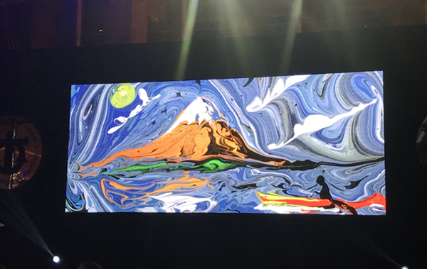 Yemeğin en ilgi çeken noktalarından biri şüphesiz, ebru sanatıydı. Sahnenin sağ tarafına kurulan masada sanatçı Garip Ay’ın yaptığı resimler, fonda temaya uygun şarkılarla ekrana yansıtılıyordu. İngilizcesi “papermarbling” olarak bilinen ebru, konukların büyük beğenisini kazandı.