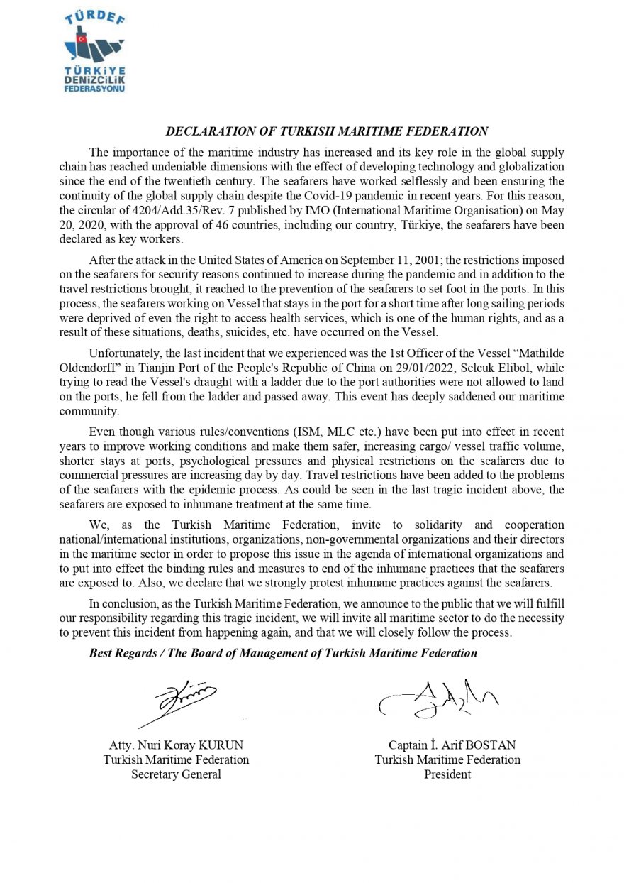 Türkiye Denizcilik Federasyonu tarafından “Denizcilerin yaşam standartlarının artırılması ve emniyetli çalışma alanlarına kavuşturulması” için yapılan açıklama şöyle: