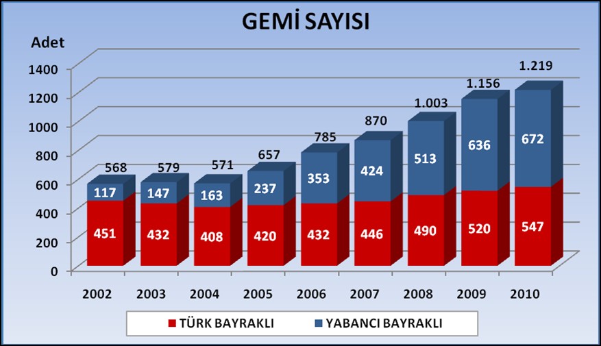 Türk sahipli deniz ticaret filosu dünya sıralamasında 01 Ocak 2011 tarihi itibariyle 15’incı sıraya yükselmiştir.