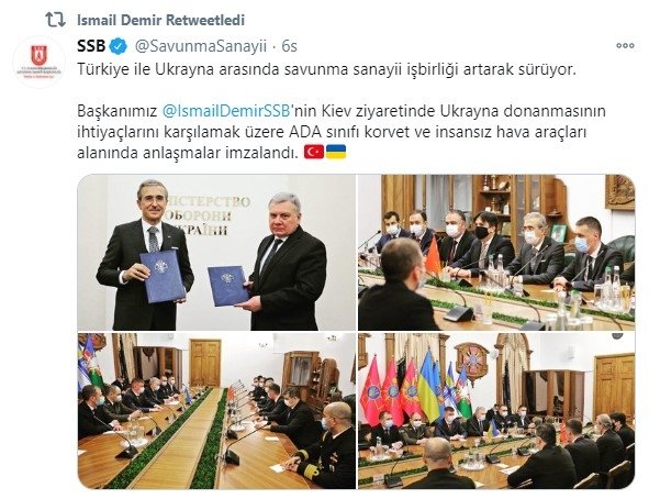 Savunma Sanayi Başkanlığının sosyal medya hesabından yapılan paylaşımda, "Türkiye ile Ukrayna arasında savunma sanayii işbirliği artarak sürüyor. Başkanımız İsmail Demir 'in Kiev ziyaretinde Ukrayna donanmasının ihtiyaçlarını karşılamak üzere ADA sınıfı korvet ve insansız hava araçları alanında anlaşmalar imzalandı" ifadeleri kullanıldı.