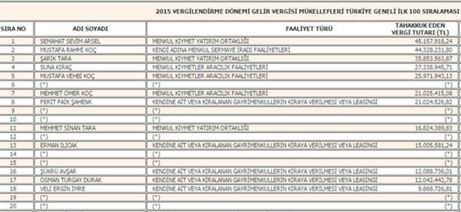 Maliye Bakanlığı Gelir İdaresi Başkanlığı (GİB), 2015 yılı vergilendirme dönemine ilişkin verilen Gelir Vergisi beyanları sonucunda, Türkiye genelinde en çok vergi beyan eden ilk 100 mükellefi açıkladı. Buna göre, 2015 için 45 milyon 157 bin 918,24 lira vergi tahakkuk ettirilen Arsel, Türkiye'nin vergi rekortmeni oldu.