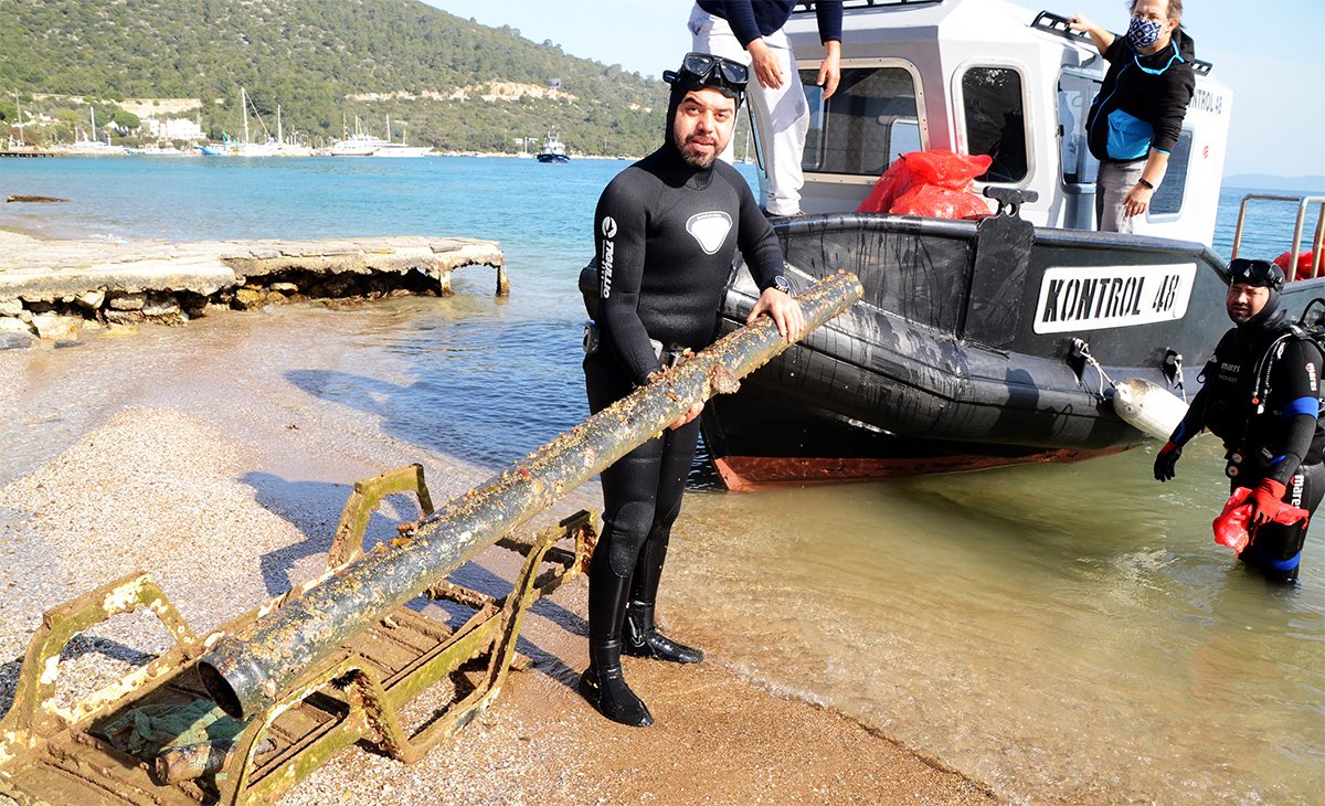 Muğla’nın Bodrum ilçesinde üç mavi bayrağın bulunduğu Torba Koyu'nda 20 dalgıcın 300 metrelik kıyıda 12 metrelik derinlikte yaptığı deniz dibi temizliğinden çıkan 30 torba atık görenleri şoke etti.
