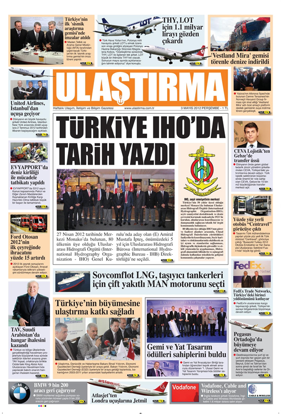 Türkiye'nin IHO'daki başarısı manşete taşınırken, sektördeki gelişmeler mercek altına alındı. Kara Ulaştırma, Deniz Ticareti, Hava Kargo, Lojistik ve Bilişim sektörüne yönelik, geniş bir yelpazede yayınlanan ULAŞTIRMA Gazetesi, zengin ve güncel haber içeriği, güçlü editoryal yapısı ile okuyucularıyla buluştu. “Ulaşım, İletişim ve Bilişim Gazetesi” sloganı ile haftalık olarak yayımlanan ULAŞTIRMA Gazetesi 25 bin adet baskı yaparak, sektöre dağıtımı yapıldı.