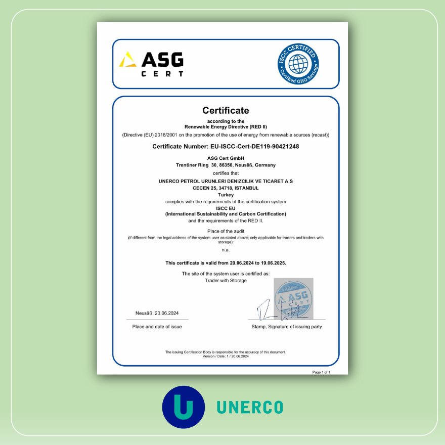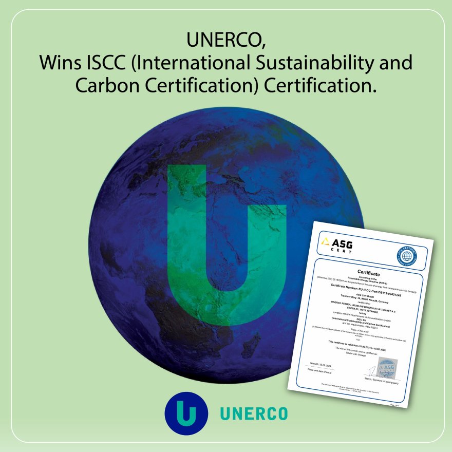 Unerco, Türkiye'nin önde gelen yakıt ikmal firmalarından biri olarak, çevreye karşı sorumlu üretim süreçleriyle öne çıkan Uluslararası Sürdürülebilirlik ve Karbon Sertifikasyonu (ISCC) sertifikasını aldı.