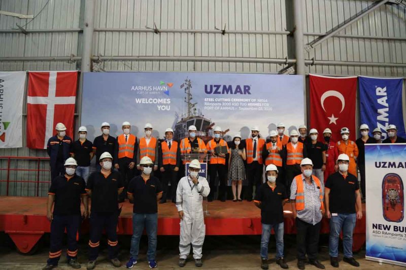 UZMAR Tersanesi, Covid-19 önlemleri dahilinde sınırlı sayıda değerli misafirin katılımıyla gerçekleşen törenle, 03 Eylül'de Danimarka'nın Aarhus Limanı için inşa ettiği RAmparts 3000 Römorkörünün ilk çeliğini kesti.