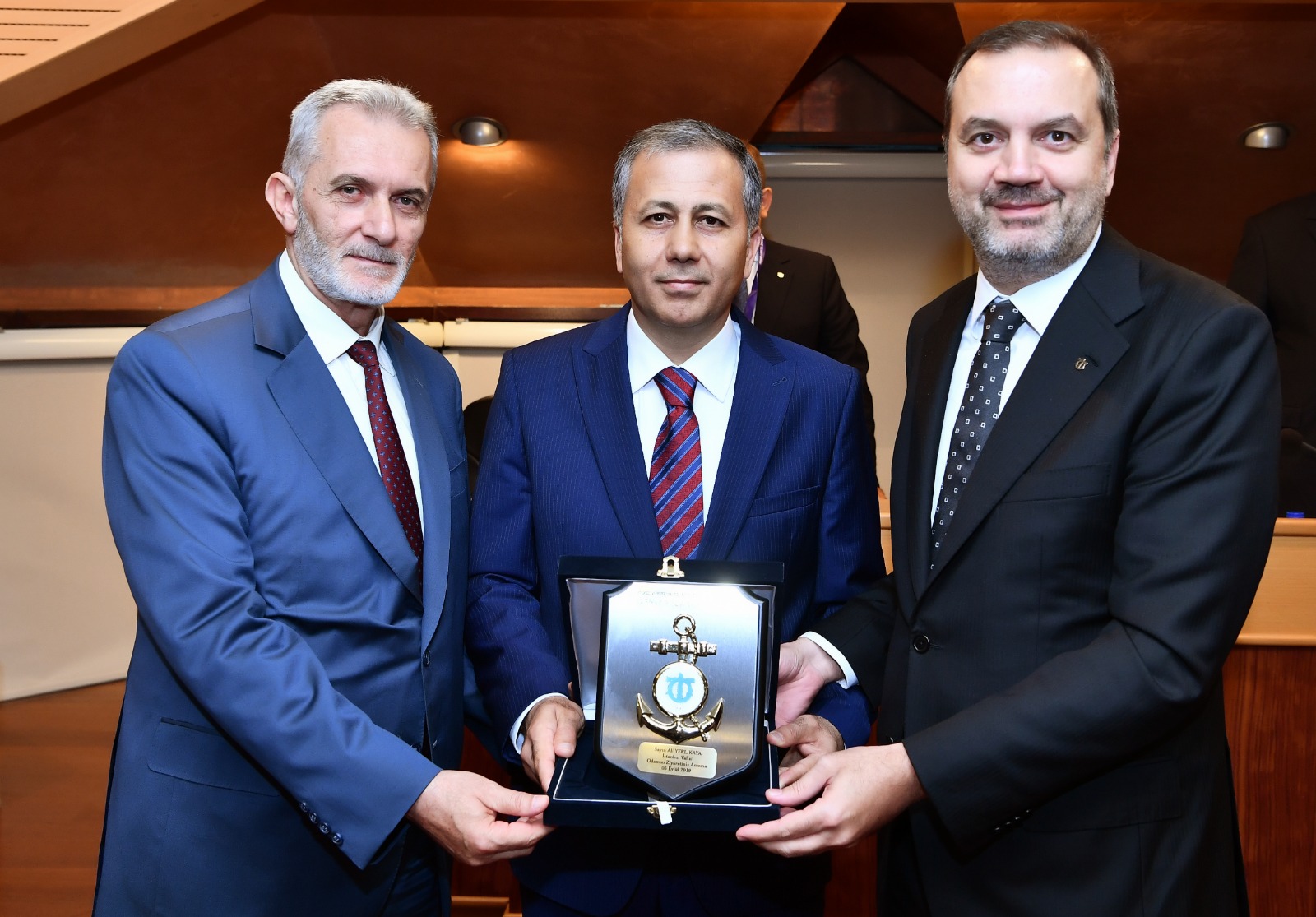 Kürsüye gelen İstanbul Valisi Ali Yerlikaya’ya konuşmaların ardından Deniz Ticaret Odası Yönetim Kurulu Başkanı Tamer Kıran ve DTO Meclis Başkanı Salih Zeki Çakır tarafından plaket verildi.