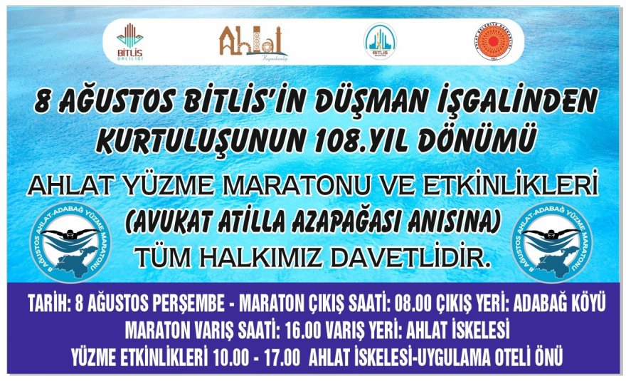 8 Ağustos'ta kutlanacak Bitlis'in düşman işgalinden kurtuluşunun 108. yıldönümü programı kapsamında, Tatvan ilçesine bağlı Adabağ köyü ile Ahlat ilçesi arasında ilk defa 14 kilometrelik yüzme maratonu düzenlenecek. Bu yıl ilki düzenlenecek yüzme maratonu geçtiğimiz aylarda hayatını kaybeden Ahlatlı avukat Atilla Azapağası anısına yapılacak.