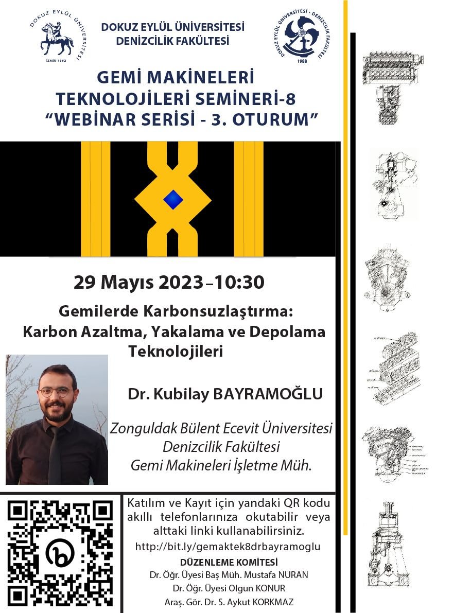 Gemi Makineleri Teknolojileri Semineri-8 Webinar Serisi’nin üçüncü oturumu 29 Mayıs 2023 10:30’da Zonguldak Bülent Ecevit Üniversitesi Denizcilik Fakültesi Öğretim Elemanı Dr. Kubilay Bayramoğlu’nun katılımı ile düzenlenecek.