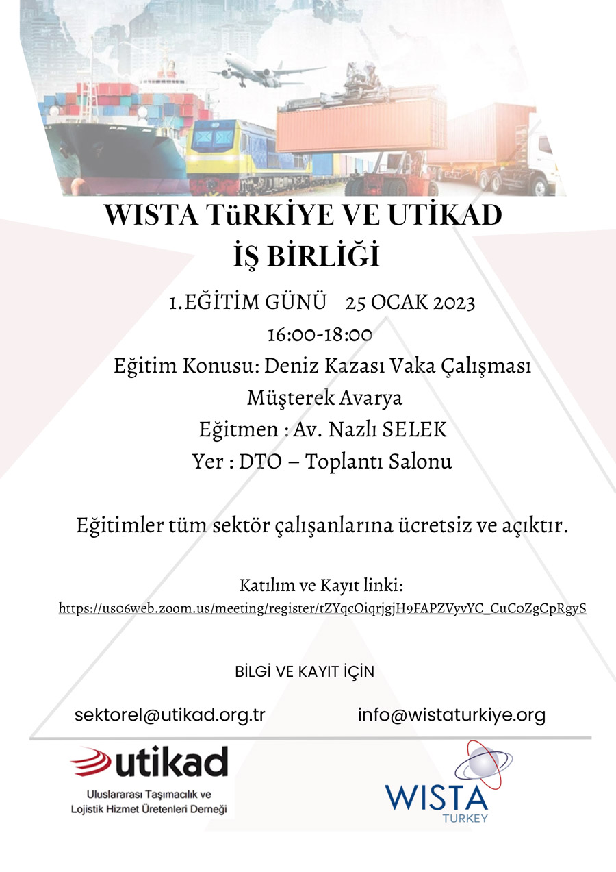 Uluslararası Taşımacılık ve Lojistik Hizmet Üretenleri Derneği (UTİKAD) ve Uluslararası Deniz Ticareti ile İştigal Eden Kadınlar Derneği WISTA Türkiye arasında lojistik sektöründe yapılacak ‘kadın’ odaklı çalışmalar için karşılıklı fikir alışverişi ve iş birliği yapılması, bilgi ve veri paylaşımı, üye tabanlarını anket ve raporlama için karşılıklı olarak kullanabilmesi amacıyla 17 Ekim 2022 tarihinde bir araya gelip, protokol imzaladı.