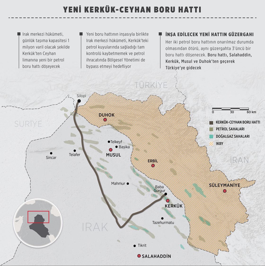 Kerkük petrolünü Ceyhan limanına taşıyacak boru hattı, Salahaddin vilayetinden başlayıp Kerkük ve Musul'dan geçip Duhok'un Fişhabur bölgesinden Türkiye'ye geçecek.