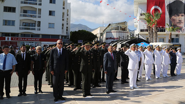 Gazimağusa Zafer Anıtı önündeki tören, anıta çelenklerin konmasıyla başladı ardından Saygı Duruşu ve İstiklal Marşı eşliğinde bayraklar göndere çekildi.