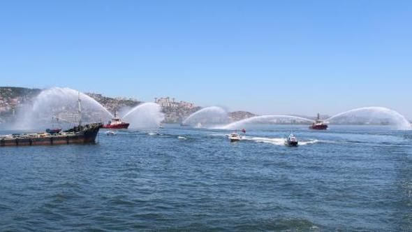 İzmit'te, Kabotaj ve Denizcilik Bayramı kutlamalarında tekneler denize açılırken, yangın söndürme gemilerinin gösterisi ilgiyle izlenildi.